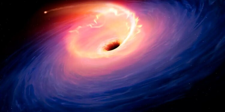 Illustration depicting a tidal disruption event (TDE). TDEs are causes when a star passes close to a supermassive black hole and get torn apart by the gravity of the latter. The debris forms a fan-shaped pattern around the black hole before eventually falling in.