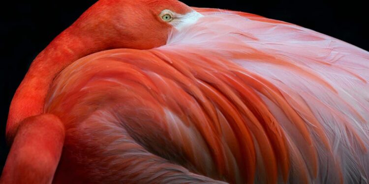 In an image by Alan Walker (shown above), two red-crowned cranes – among the largest and rarest birds in the world – throw their heads back in a courtship ritual as snow falls around them. In another, a vibrant flamingo, photographed by Robert Clark, rests its head on its feathers, which almost evoke the quality of an oil painting (main picture).