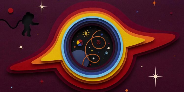 An artwork made my layering many paper cutouts, showing an astronaut near a black hole. Within the black hole are colourful swirls, stars and specks