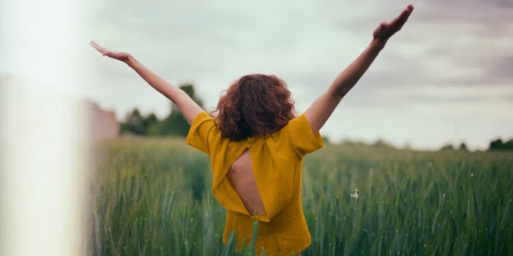Female in a field with her arms in the air as though she is happyShare on Pinterest