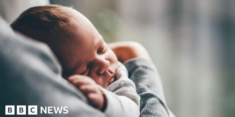 Getty Images A baby lies asleep in its carers arms. Getty Images
