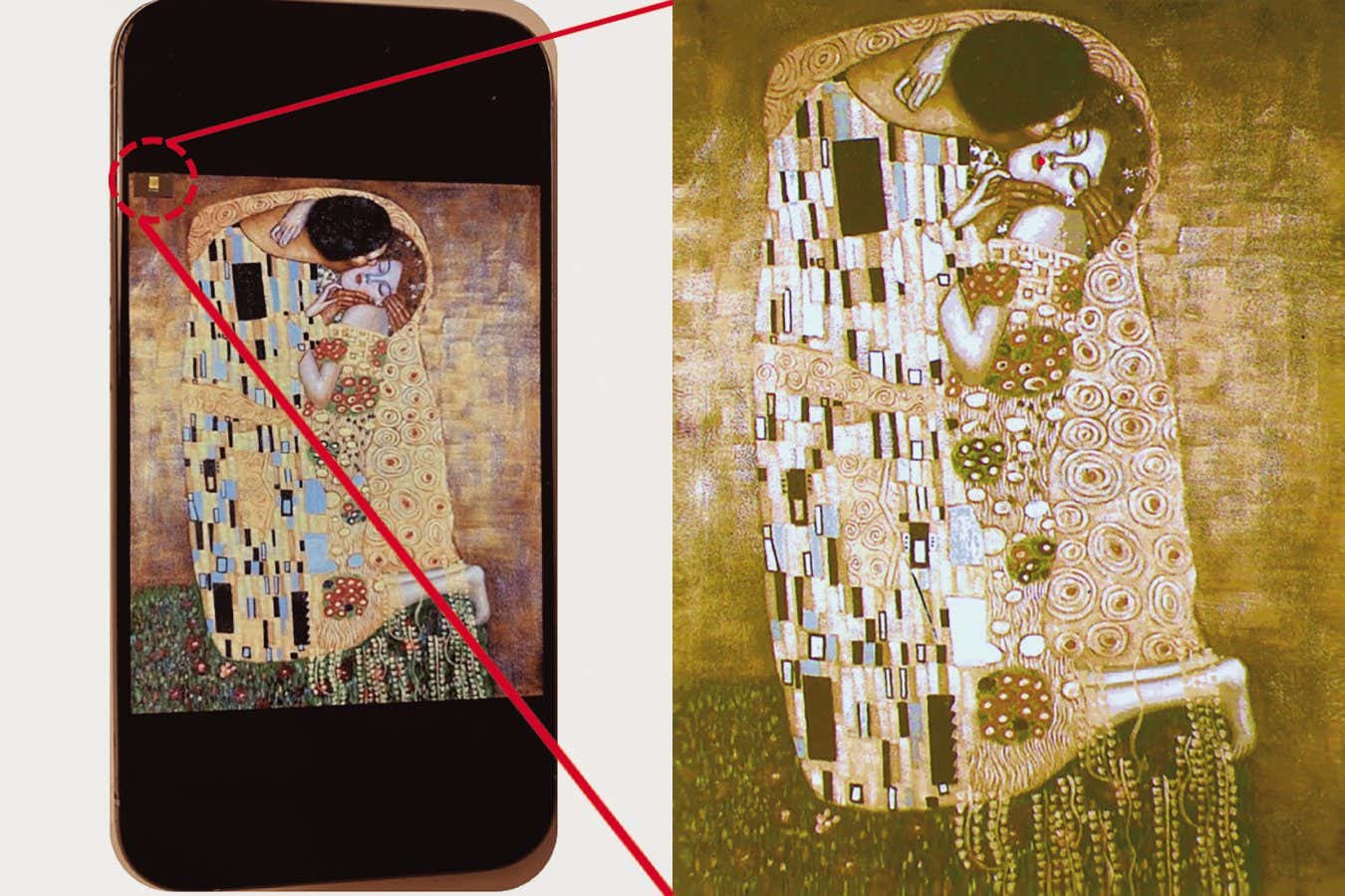 Gustav Klimt’s The Kiss displayed on an iPhone (left), on which a small e-paper display with the same image (right) is placed