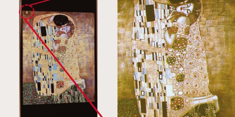 Gustav Klimt’s The Kiss displayed on an iPhone (left), on which a small e-paper display with the same image (right) is placed