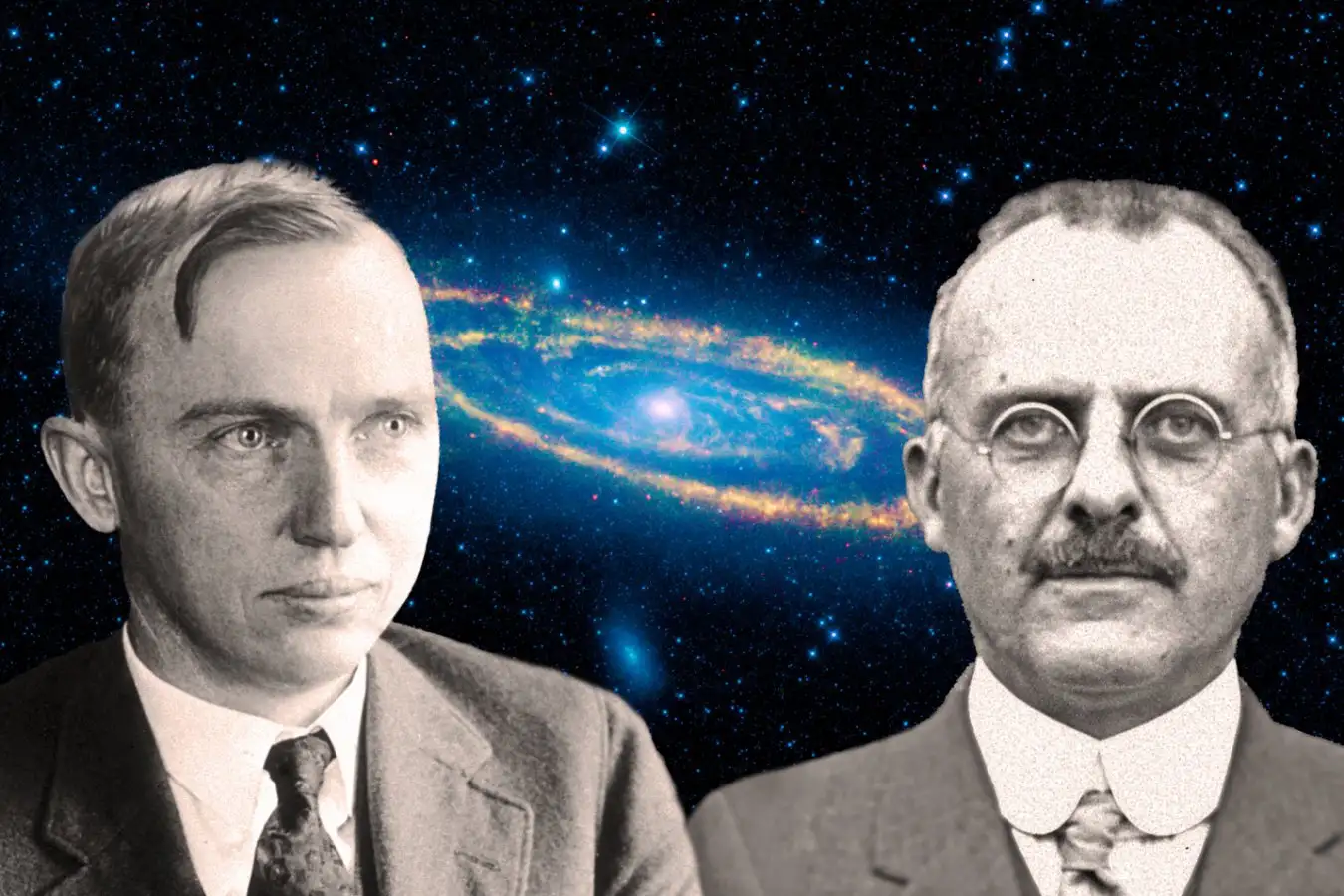 In 1920, all that arguing culminated in the Great Debate. Two renowned researchers, Harlow Shapley and Heber Curtis, gave prepared talks to the general public on whether the spiral nebulae, including what we now call Andromeda, were small clouds on the edge of our galaxy – which would mean our galaxy was the only thing out there – or if the nebulae were actually galaxies beyond our own, implying a much bigger and wilder universe.
