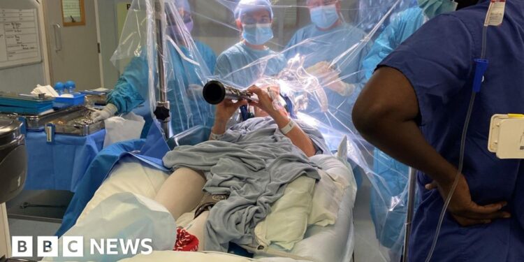 PA Media Denise Bacon lying in a hospital bed in a blue gown playing the clarinetPA Media