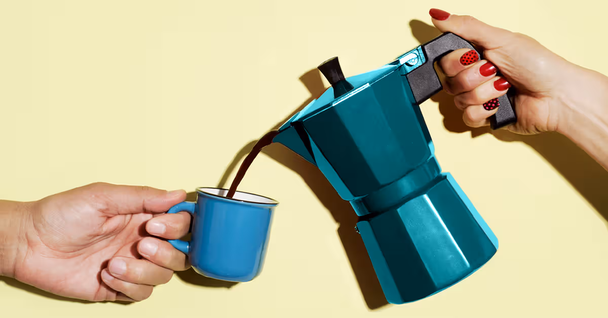 Teal coffee pot pouring coffee into a blue mug against a yellow backgroundShare on Pinterest