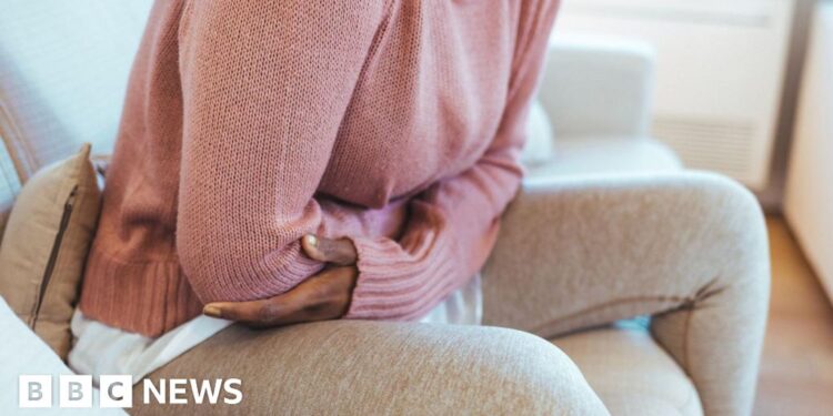 Getty Images A woman sitting on a cream sofa, with her arms folded around her stomach. the woman's face cannot be seen. She is wearing a pink jumper and beige leggings and is partly hunched over.Getty Images