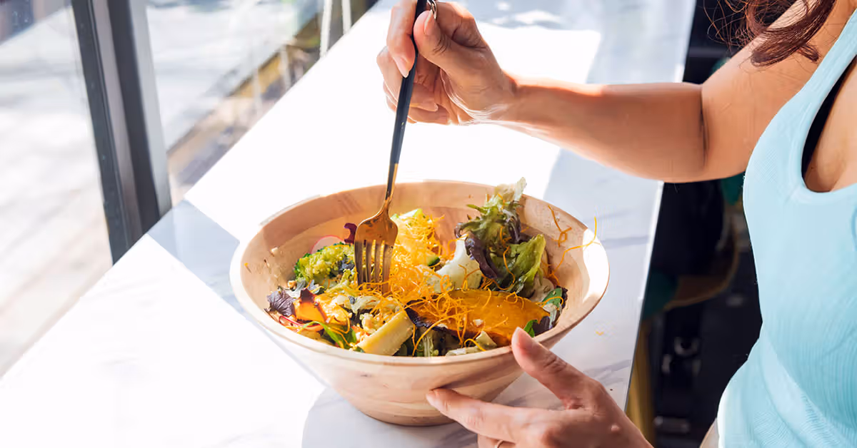 Female eating a bowl of salad by a windowShare on Pinterest