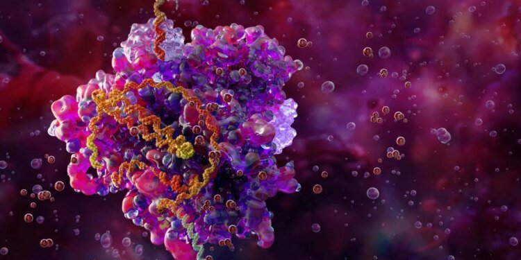 Illustration of the CRISPR-Cas9 gene-editing complex (pink and purple) bound to DNA (helix)