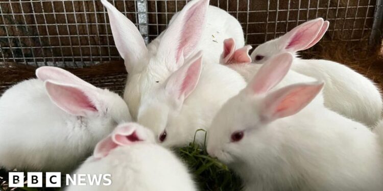 Getty The picture shows a group of six white rabbits huddled closely together inside a wire enclosure. Their fur is very clean and soft-looking, and their ears are upright and pinkish on the inside. The rabbits are gathered around, eating a pile of green grass. They appear calm and are surrounded by a mesh fence, which forms the background of the image.Getty