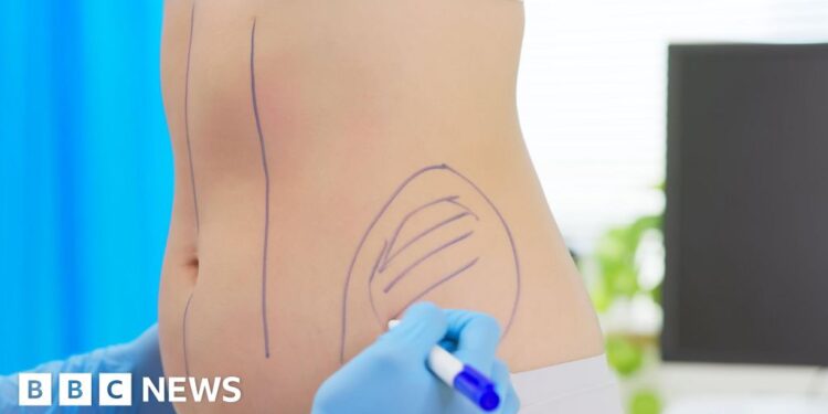 Getty Images A clinician wearing blue gloves draws surgical markings on a woman’s abdomen and waist in preparation for a cosmetic procedure, with blue privacy screens in the background.Getty Images