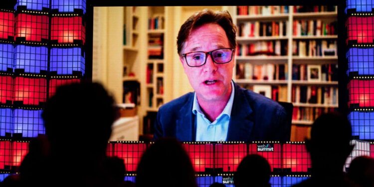 Nick Clegg, then working as an executive at Meta, addresses a tech summit in Portugal in 2021