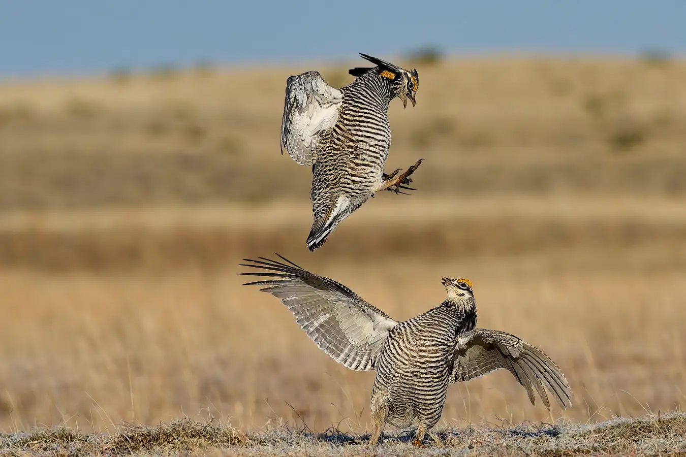 The winning photo in the behaviour category shows a fight between two male greater prairie-chickens (Tympanuchus cupido), snapped by Peter Hudson at the Pennsylvania State University. Like many grouse species, males gather at a so-called lek during the breeding season, where they compete for mates by leaping into the air and attempting to strike their opponent.