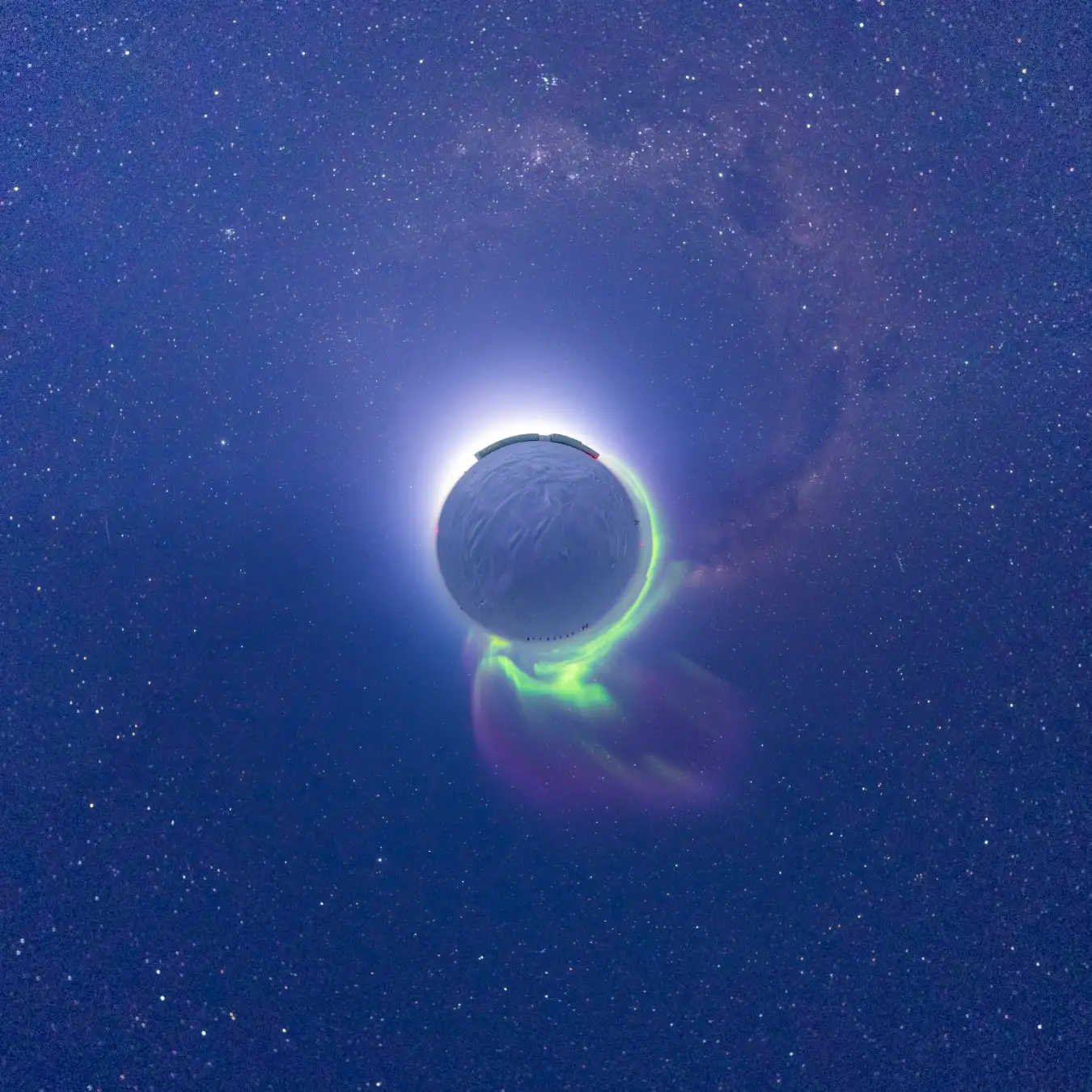 The return of the sun after six months of darkness at the South Pole is captured in this image by Aman Chokshi at McGill University in Canada, the runner-up in the astronomy category. Chokshi had to heat up his camera and contend with the icy wind at -70°C (-94°F) for several minutes to take a 360-degree panoramic shot of the horizon as the sun rose. He then turned it into a stereographic image resembling a small planet, fringed by a green and purple aurora with the Milky Way above.