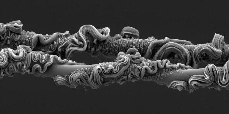 These twisting threads wrapped in thinner, looping strands are the silk of an Australian net-casting spider (Asianopis subrufa), a consummate ambush predator. Instead of building a web and waiting for prey to fall into it, this spider holds its net in its front four legs and throws it over a hapless insect. As this electron microscope image shows, its silk is specially adapted for this unusual hunting technique: it consists of an elastic core encased in a sheath of harder fibres of varying sizes, making it both strong and exceptionally stretchy.
