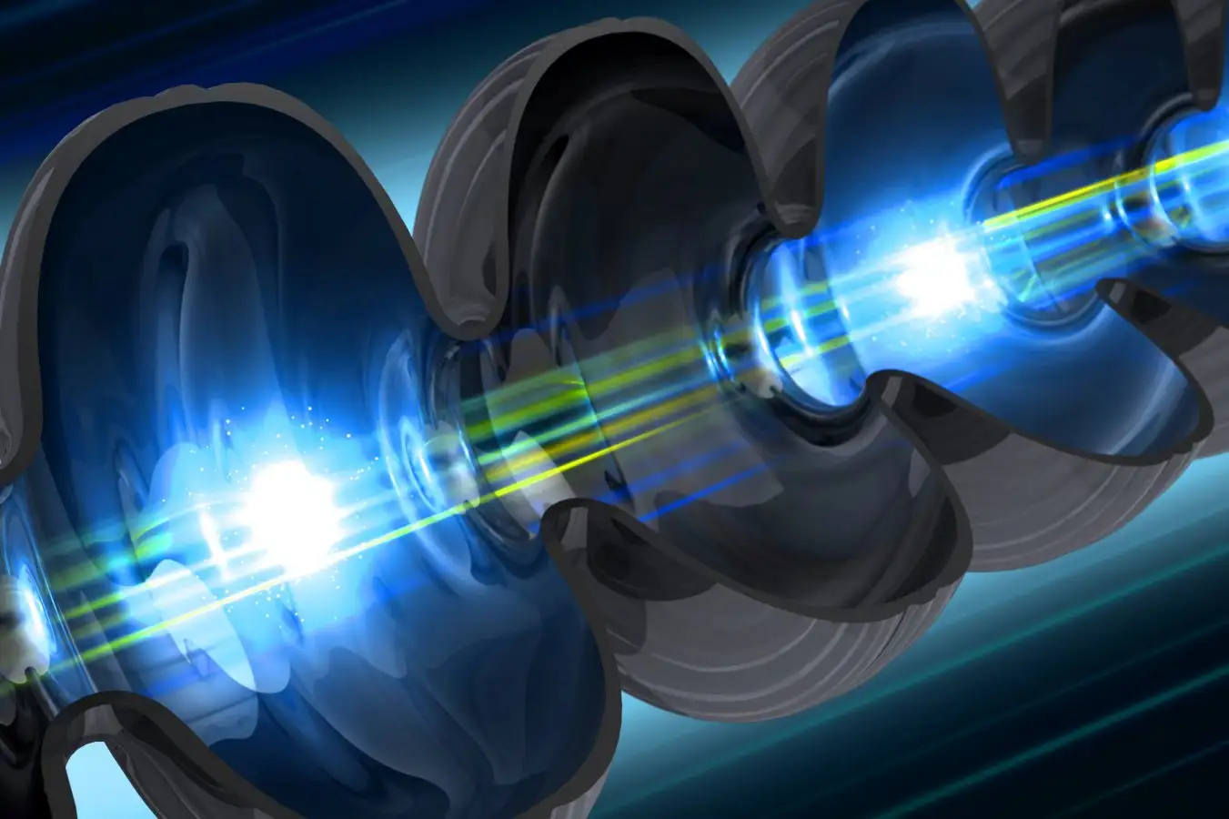 An illustration of an electron beam traveling through a niobium cavity, a key component of SLAC’s LCLS-II X-ray laser