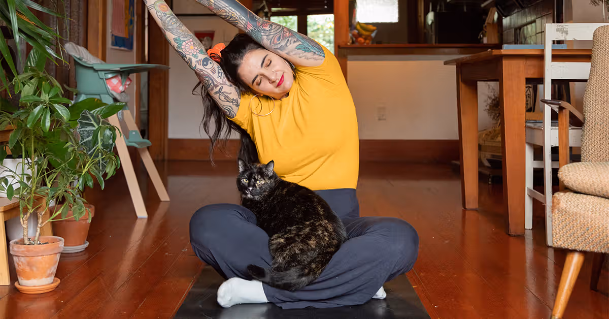 younger white woman with tattoos stretching while in lotus pose on the floor, cat in her lapShare on Pinterest