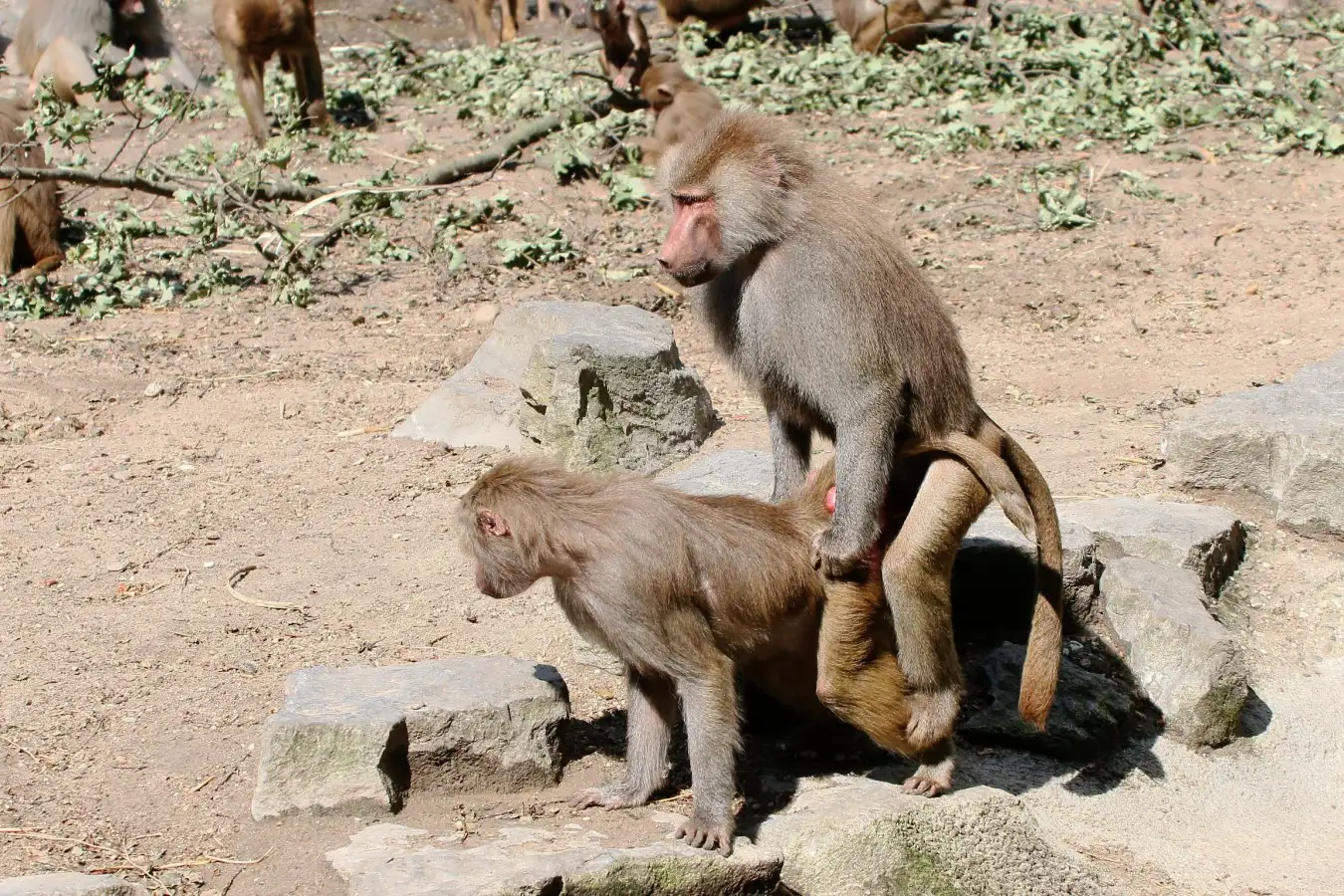 A male Hamadryas baboon (Papio hamadryas) displays his dominant status by mounting a lower-ranking male