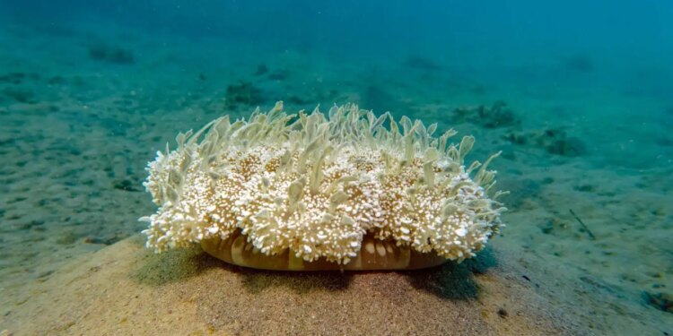 An upside-down jellyfish in its natural habit on the seabed