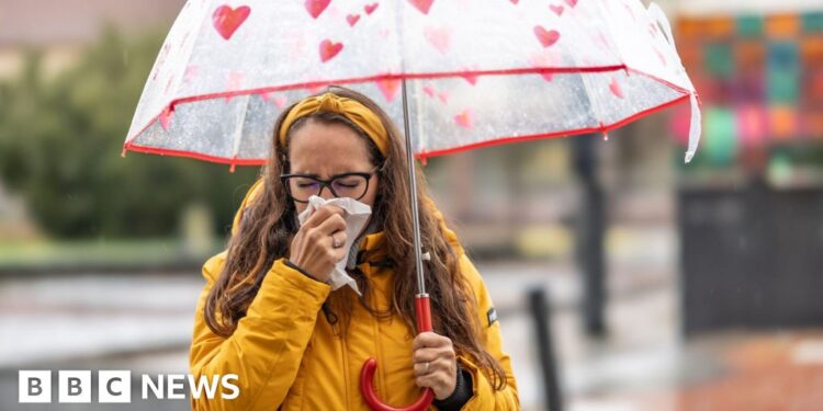 Getty Images A woman blowing her nose and sneezing into a handkerchief during a rainy autumn day. She is wearing a yellow rain coat and a red umbrella Getty Images