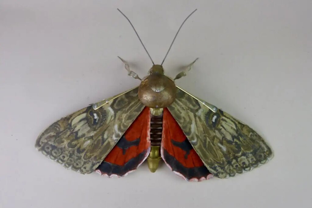 Magazine editor Eleanor Parsons and I began by enthusing about each of the featured species. “Ooh widgeon! Curlew! Long-tailed tits!” Next, we played the “which-would-you-buy” game, only to discover that the piece I liked the most was the least practical: an astonishing found-object sculpture of a red underwing moth (above) by Dean Patman. At the time of writing, it is still available, if you share my appreciation of moths and have £1750 to spare.