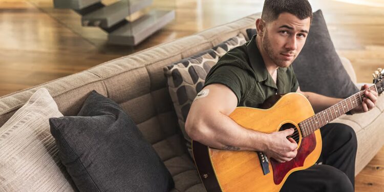 Nick Jonas sits on couch with guitarShare on Pinterest