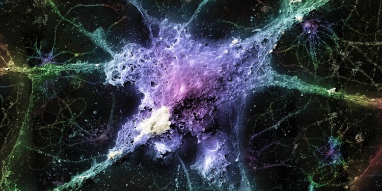 A scanning electron micrograph of a mouse nerve cell that is affected by misfolded versions of the proteins amyloid and beta, which are thought to drive Alzheimer’s disease