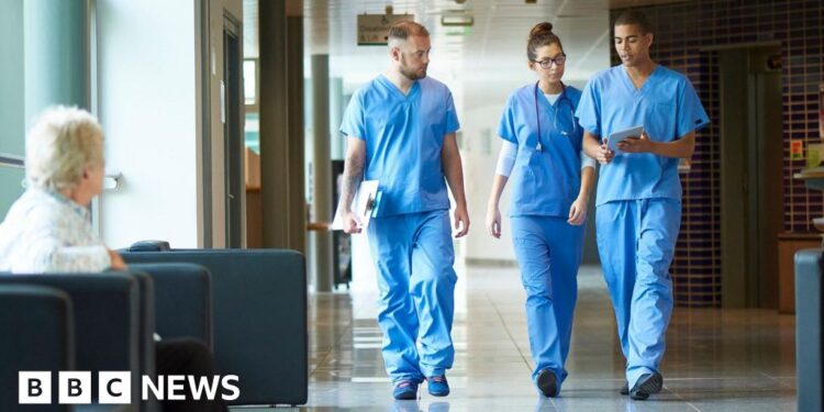 Getty Images Three medics in blue scrubs, two men and a woman, walk along a hospital corridor. One of the men is holding a clipboard, the other some papers and the woman has a stethoscope around her neck. They are walking side by side, engaged in conversation. In the foreground, there is woman sitting on a black cushioned chair. She is turned away from the camera, looking towards the medics.Getty Images