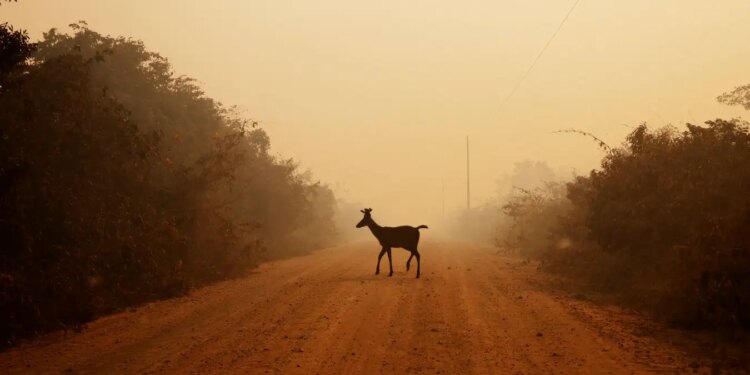 A marsh deer escaping a forest fire in Poconé, Mato Grosso, in 2020