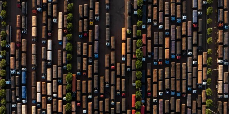 Some of the thousands of trucks that transport soya beans down a road in the Amazon