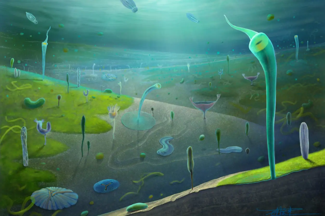 Artist’s reconstruction of the ancient ocean ecosystem preserved in the Jiangchuan biota