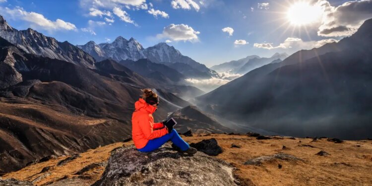 Young woman, wearing a orange jacket, is reading a book on an ebook reader during sunset over Himalayas. She is sitting on the top of a mountain and holding the e-reader.The afternoon sun on the background. Mount Everest National Park. This is the highest national park in the world, with the entire park located above 3,000 m ( 9,700 ft). This park includes three peaks higher than 8,000 m, including Mt Everest. Therefore, most of the park area is very rugged and steep, with its terrain cut by deep rivers and glaciers. Unlike other parks in the plain areas, this park can be divided into four climate zones because of the rising altitude. The climatic zones include a forested lower zone, a zone of alpine scrub, the upper alpine zone which includes upper limit of vegetation growth, and the Arctic zone where no plants can grow.