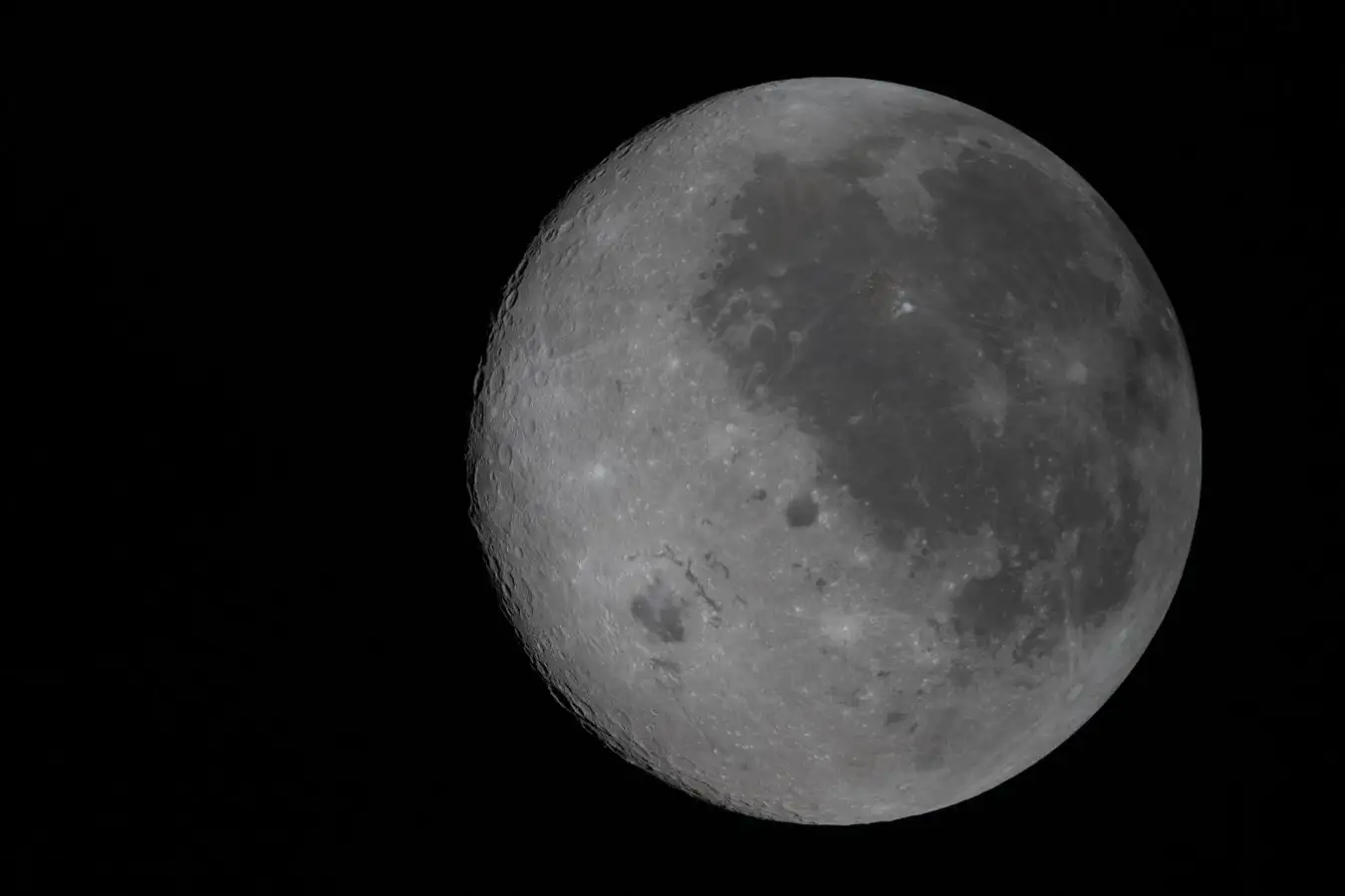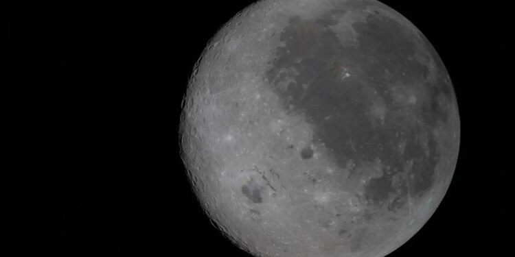 The near side of the moon is visible on the right, identifiable by the dark splotches that cover the surface. Left of this begins the far side that we can’t see from Earth