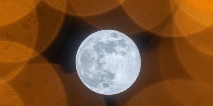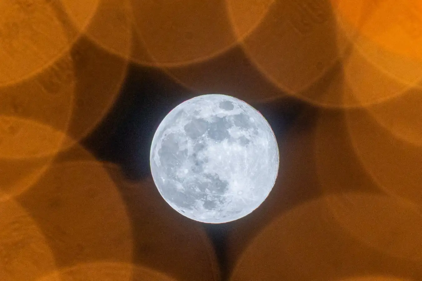 Christopher Cokinos’s history of the moon Still As Bright is out this month. Pictured is a supermoon in January 2026, seen behind illuminated Christmas lights