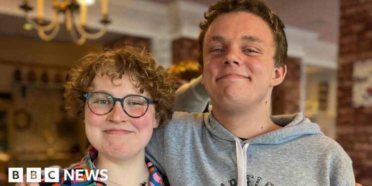Emma Christie A young man stands with his arm around a teenage girl. They are both smiling broadly at the camera. Hazel is wearing glasses and a colourful shirt; her hair is short and curly. Lachlan has short hair and is wearing a grey hooded jumper. They appear to be in some kind of restaurant. Emma Christie
