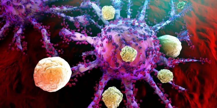 Illustration of T-cells attacking a growing cancer cell