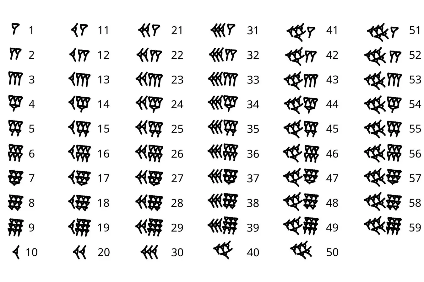 These marks allow you to count up to 59, so what happens when you hit 60? Well, the Babylonians simply started again, using the same mark for 1 as they did for 60. This base 60 number system was handy because 60 is divisible by so many other numbers, making calculations easier, which is partly why we still use it for telling time today. But not being able to distinguish between 1 and 60 was a big downside.