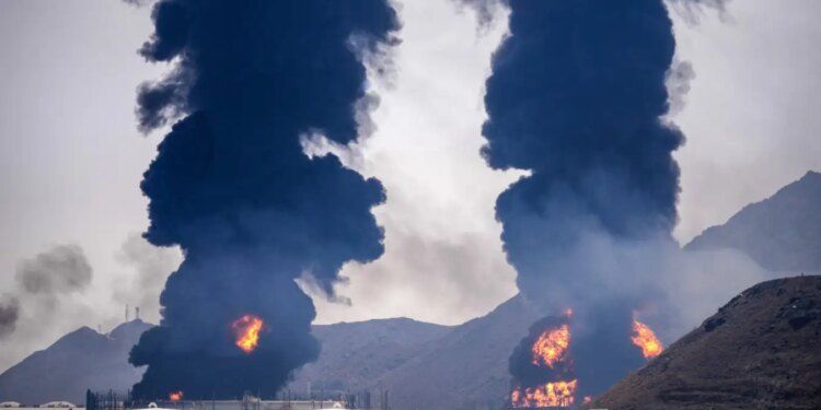 Plumes of smoke and fire at an oil facility in Fujairah, United Arab Emirates