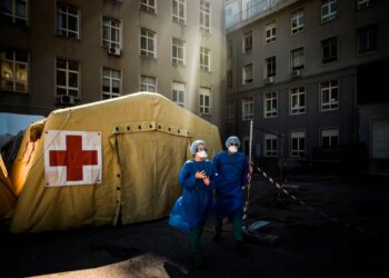 Health workers by a triage tent for people suspected of having covid‑19 in Lisbon, Portugal, in April 2020PATRICIA DE MELO ...