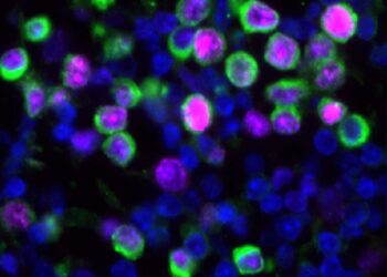 Lung tissue samples from mice, showing the nuceli of cells (blue), cancerous cells (green) and markers of proliferation (magenta)Bryan Johnson ...