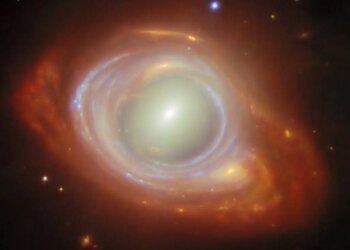 A James Webb Space Telescope image of a rare cosmic phenomenon known as an Einstein ring, two galaxies separated by ...